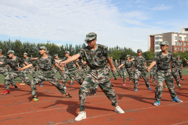 军体拳和匕首操方队的同学英姿飒爽的动作、坚毅沉稳的眼神体现出这六天时间在他们身上留下的军事素养。