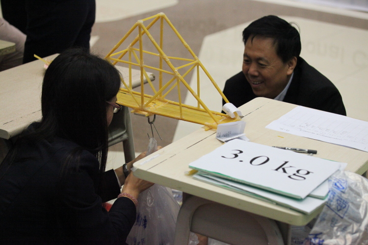 三个赛段的比赛完成了,裁判紧张地统计成绩,此时参加表演比赛的老师们拿着自己的桥梁作品上场了。学校领导和老师一起走进赛场参与载重测试,大家需要在十分钟内完成对桥梁的加码测试载重量。站着的,蹲着的,跪着的,思考着的,笑着的,操作着的,亲身感受创意大赛带来的魅力和刺激,现场欢呼声不绝于耳,气氛轻松而又热烈紧张。