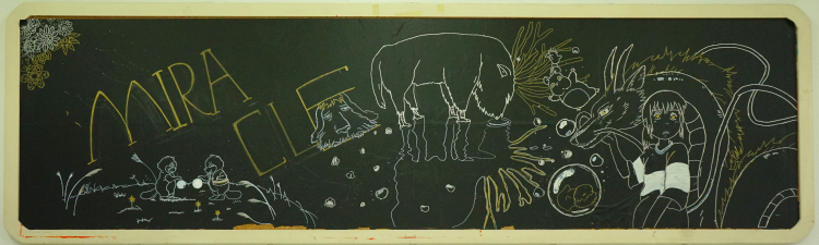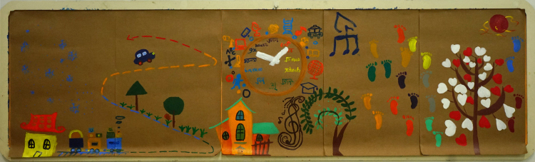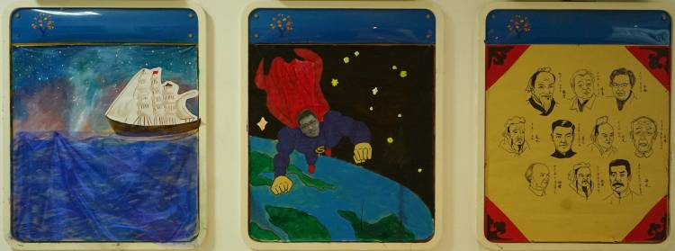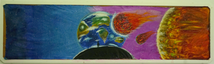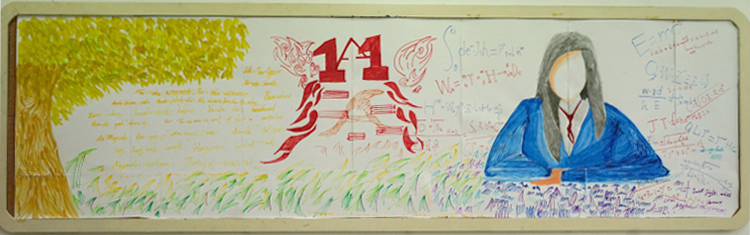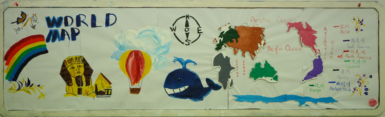 我们班的外墙板报阐述了人类从古至今并展望未来的历程。坐着小船沿着时光的河流前行,第一站:我们绘画了中国各个领域中里程碑一样的伟人,缅怀先辈并以鉴往来。光阴似箭从不停留,随其来到第二站:漆黑的宇宙中有着点点繁星,湛蓝的地球中有一位超人向我们飞来,他就是我们的班主任——崔政老师,我们不断创新不断发展,最终从地球飞向太空去探索神秘未知的宇宙。时光飞逝第三站上的小船象征着我们8A班的未来,上方是千变万化的星空,下方是浩瀚无垠的大海,而我们乘风破浪地向着未来前行。