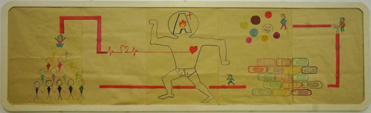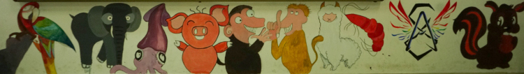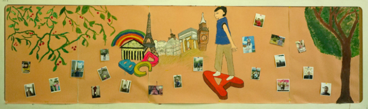 接下来是壁纸绘制,首先映入眼帘的是我们班的班标。飞扬的翅膀代表了8A团结向上的心,无论前方路是怎样我们始终在一起。墙上的卡通人物是8A班老师与同学的化身,贴近日常生活,使彼此更加亲近。