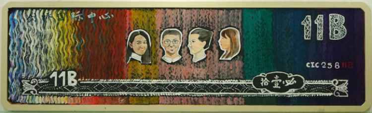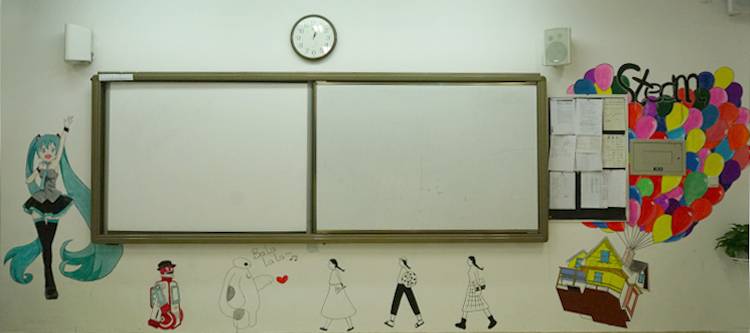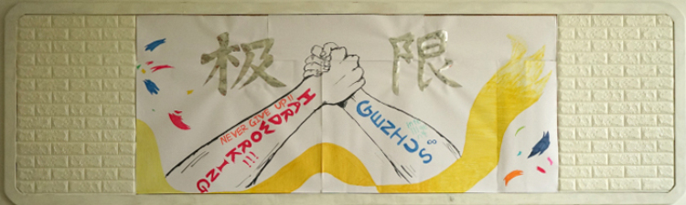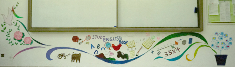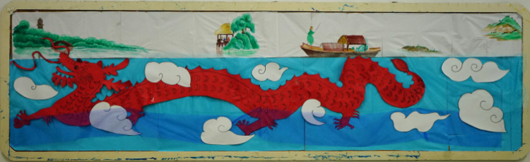 内墙的灵感来源于刘禹锡的诗句“山不在高,有仙则名;水不在深,有龙则灵”。海里游龙上的每一块鳞片代表着8A班的每一位同学,龙头则是我们特厉害的班主任,引领着我们从深海向天空蜕变。“云从龙,风从虎”一朵朵洁白无瑕的祥云围绕着赤龙。天空中有一座座小山,山虽不高却因其中的仙人和小童而名扬天下。仙人就是剑桥的老师们而小童则是剑桥学子,在仙人的循循教导下茁壮成长。