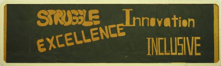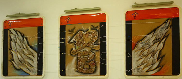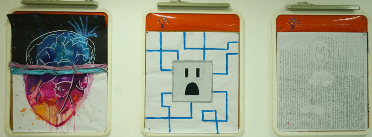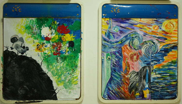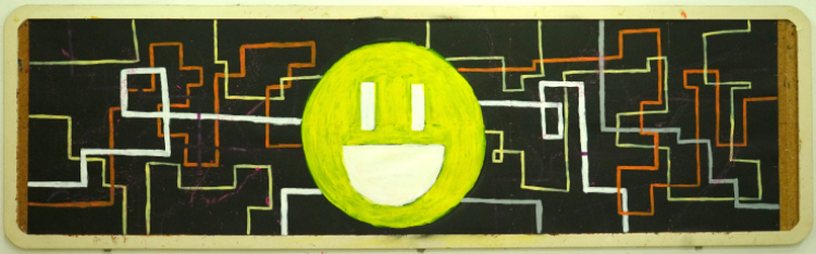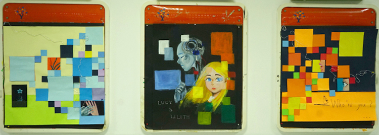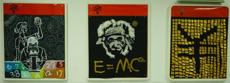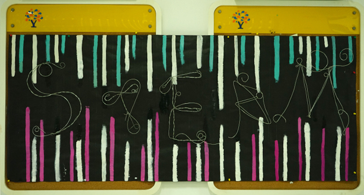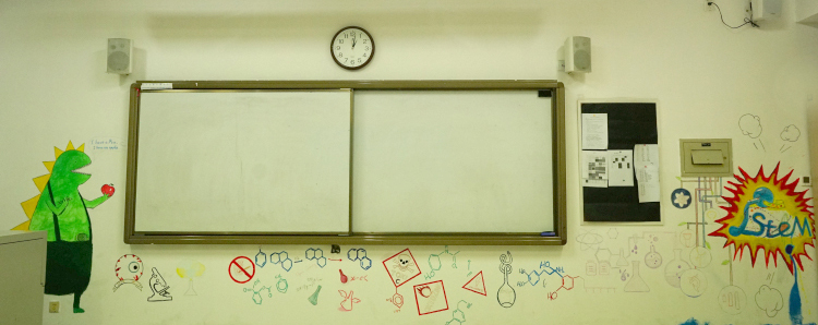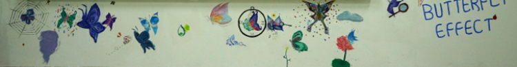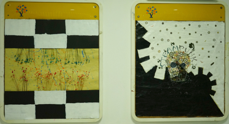 外墙板报我们则选择了STEAMPUNK蒸汽朋克来作为主题,灵感来源于艺术与科学。蒸汽朋克是中学生人文特质的体现,是一种独特的艺术风格,是由寻常不过的科技技术衍生转变而成的一种艺术形式,以厚重的金属质感和繁琐却利落的中性风来带给人们强烈的视觉冲击。而我们认为蒸汽朋克所谓冰冷机械的鲜活灵魂正是艺术与科学最完美的诠释。其中,STEAMPUNK中又巧妙的嵌入了本次板报设计的主题单词“STEAM”。中间我们采用机械零件,即蒸汽科技的重要元素,拼凑成一个代表PUNK的骷髅头,来凸显灵感主题。而上面书写的“STEAMPUNK”我们则选择了哥特风字体,与旁边手绘的STEAM MACHINERY的衍生图案,同时采用金属质感配色,和海报上的机械零件相呼应。图案下方的白色颗粒则是粘贴成喷绘形状的夜光粉,给人带来别样是视觉效果。背景绘制成齿轮形状分割开的黑白大面积配色,和内班后板报成为一系,配色偏向科学,又和另一个板块和内班前墙色泽大胆,浓厚活泼所代表的艺术风格形成鲜明对比,即,艺术与科学。