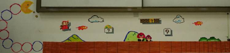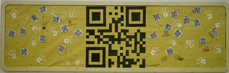 因为我们班都是选修ICT的,所以后墙板报就采取了与ICT相关的二维码。在我们眼里,艺术总是多彩的,而科技却是严肃的黑白画,所以,我们班前墙的配色就比较丰富,颜色比较艳丽,而后板报就是偏向于黑白风格的设计了。中间的这个巨大的二维码,是纯手绘而成的,绘制的过程十分细致,需要测量出整体的长宽高和每一个小方格的大小,这也象征了我们对于艺术与科学所需要的一丝不苟,各位可以扫一扫看看,能扫出来什么!………哈哈哈没错,就是“10B帅”!这大概也算是我们班的班级精神吧!在这个大的二维码周围,是21个小的二维码,通过扫它们可以看到我们班每个同学包括我们的班主任的名字和昵称!这21个小二维码围绕着大二维码也象征了我们班的团结精神!