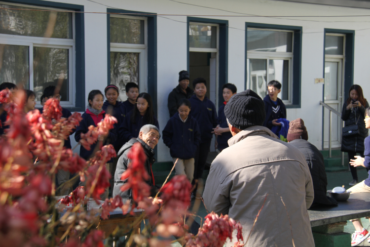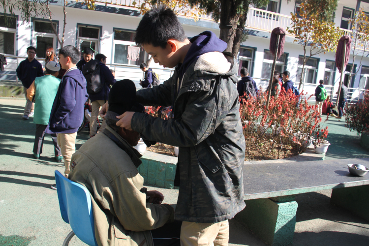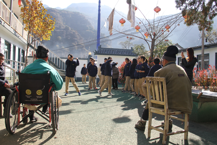 踏入大门,一位老爷爷正坐在台阶上晒暖,他的脸上留下了岁月的沧桑,但看到我们后,露出了灿烂的微笑。同学们分成两队,一队来到厨房,擀皮的擀皮,包饺子的包饺子,我们像一家人一样,其乐融融得为老人们做着爱心饺子。另外一队到23位老人活动的院子里表演节目,他们唱起了红歌,跳起了舞蹈,老人们喜笑颜开,拍着手,虽然他们有的听不见,有的残疾,有的智障,但可以看出来他们内心像孩子一样快乐的心情。