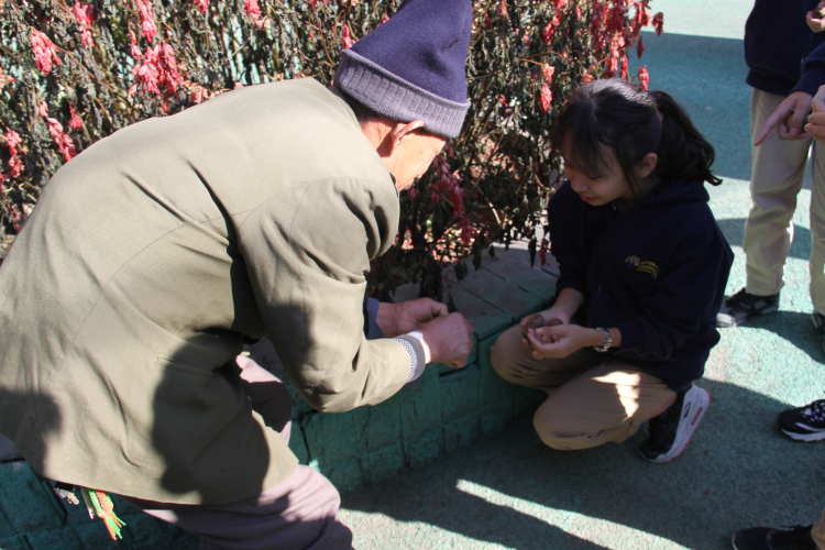 我看到一个爷爷,他招着手示意我过去,我坐在一个石板上“爷爷好!” “哎,你好小姑娘。你是哪个学校的?” “我们是恒信彩学校剑桥中心的,您今年高龄呀?” “我86了,咳咳”爷爷咳了两声。“您多注意保护身体。” “嗯,你们要好好学习,长大了给社会做贡献。” “好!我们回头来看您。” “好好好,欢迎你们来!” “爷爷再见!” 这简短的聊天,看见了老人对我们的希望和对祖国的热爱。——以上文字摘自7A班 戴嘉凝文稿