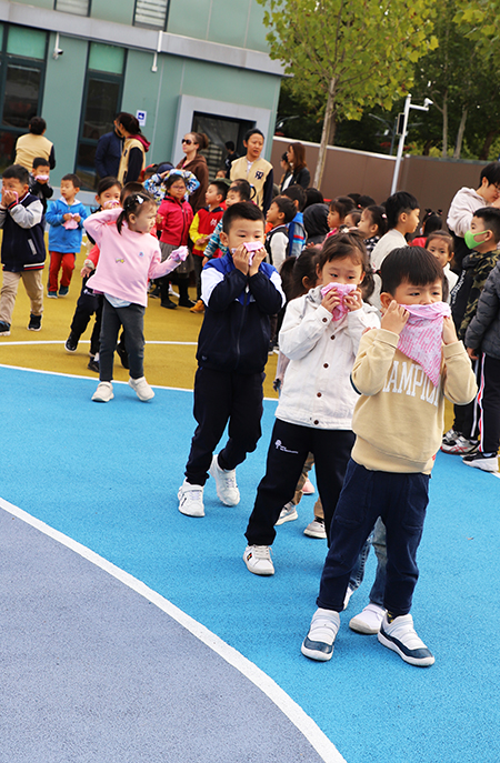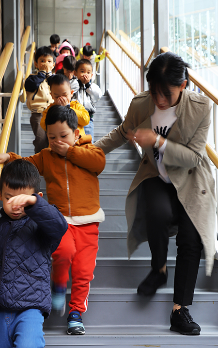 上午9:30,火灾紧急警报声响起,各班教师迅速按紧急预案的疏散线路带领幼儿拿起湿毛巾,捂住口鼻,弯腰小步快走,安静迅速下楼。