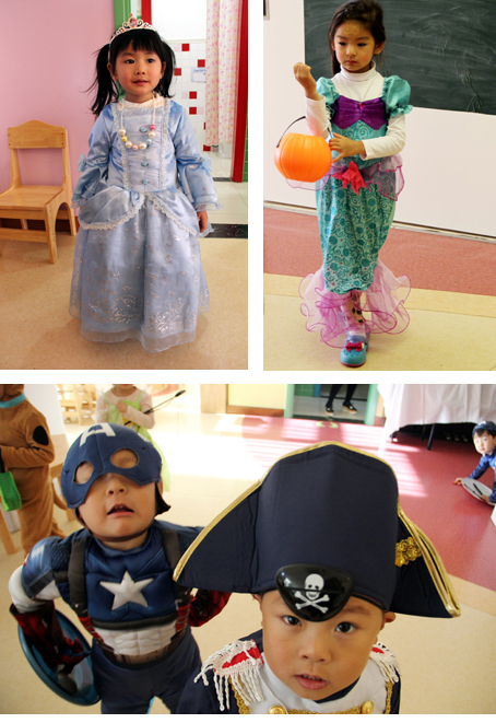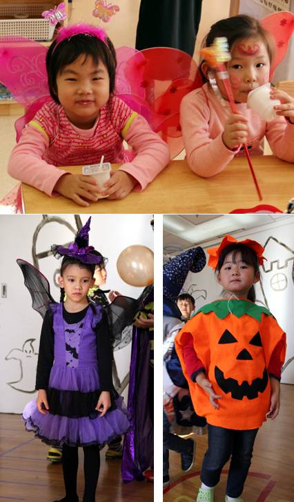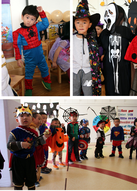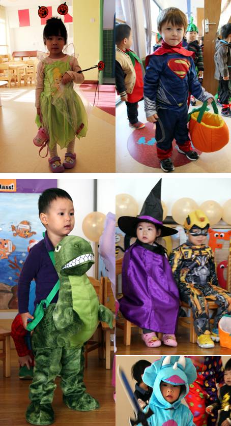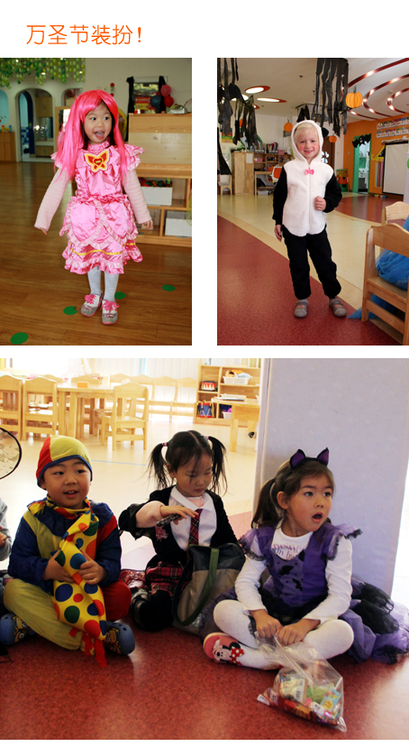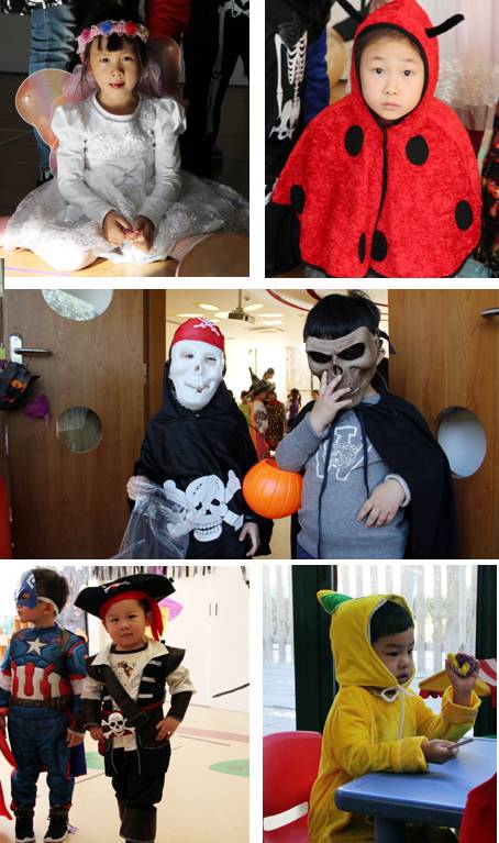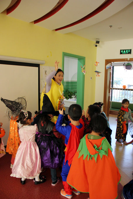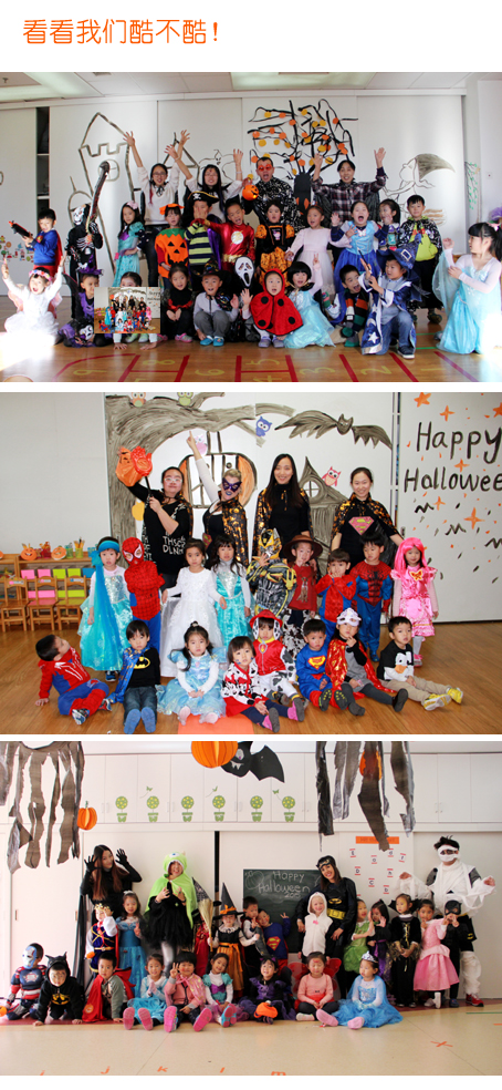 今天一大早,小朋友和老师就盛装打扮起来,一起进行有趣的万圣节游戏。