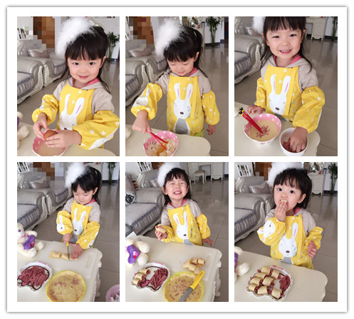 别看咱们年龄最小,做起饭来有模有样。打鸡蛋,或面糊,切鸡蛋卷,和妈妈一起开心把卷吃。