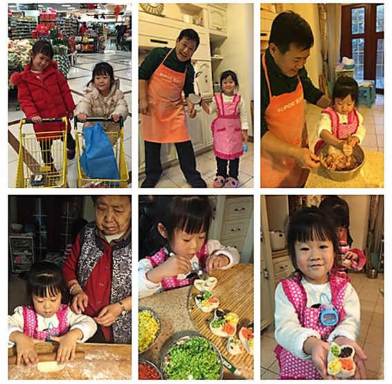 姐姐陪妹妹去买食材,爸爸和面拌肉馅,姥姥帮忙擀皮捏形,
