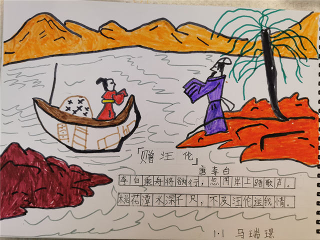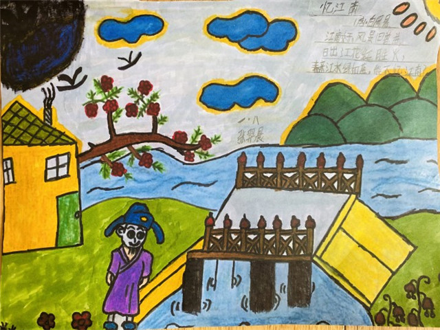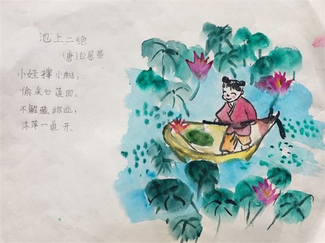 王国维在《人间词话》 中言“境非独景物也,喜怒哀乐亦人心中之境。”古典诗歌是情与景、心与物的相互交融,诗人往往借助景物而抒情。当一首诗写意在一方素纸上,一腔诗情也便随着画中的景物在浓墨重彩处涓涓流淌。一二年级的小豆包们将诵读的古诗变成一幅幅美丽的画面,诗情画意,诗融在画中,画意在诗里。
