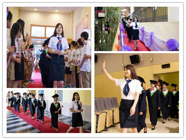 迈着稳健的步伐,由班主任老师引领着,在两旁鲜花相送的簇拥下,全体六年级毕业生从小学部大厅一路踏着红毯,缓缓步入主会场……