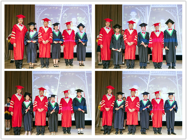 激动人心的时刻到来了,每一位毕业生按照班级顺序依次上台站好,由蓝春校长、关林峰校长、李放大博士、魏庆佳校长为他们点拨智慧、颁发毕业证书,并合影留念。