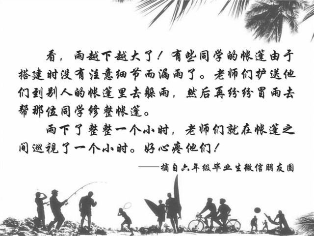 天公不作美,突然乌云密布、狂风大作,眼看就要下雨了。老师们迅速做出决定,暂停所有娱乐项目,带领孩子们快速返回营地,并齐心协力搭好了帐篷。大雨接踵而来,倾盆而至!老师们护送所有学生躲进了帐篷,自己却留在了外面。雨中,老师们在帐篷间来回巡视着,确保每一个帐篷都不漏水,确保每一个孩子都安全。