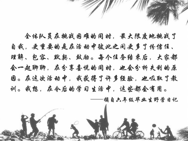 光阴似箭,为期两天的野营活动一眨眼就过去了。在这精采的两天生活里,孩子们从各式各样的游戏、活动中学习了很多在课堂上学不到的东西。两天一夜,说不完的快乐,道不完的感动!相信,这次的经历会是所有六年级师生记忆中永存的美好。