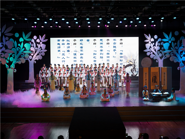 时光穿梭,古今相对。四年级的孩子们用吟、诵、歌、舞等形式再现了国学经典的博大精深,正可谓:经典启迪智慧,国学浸润人生。