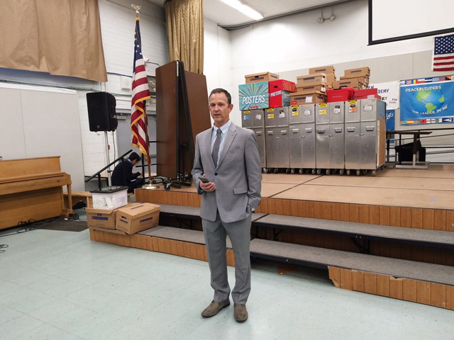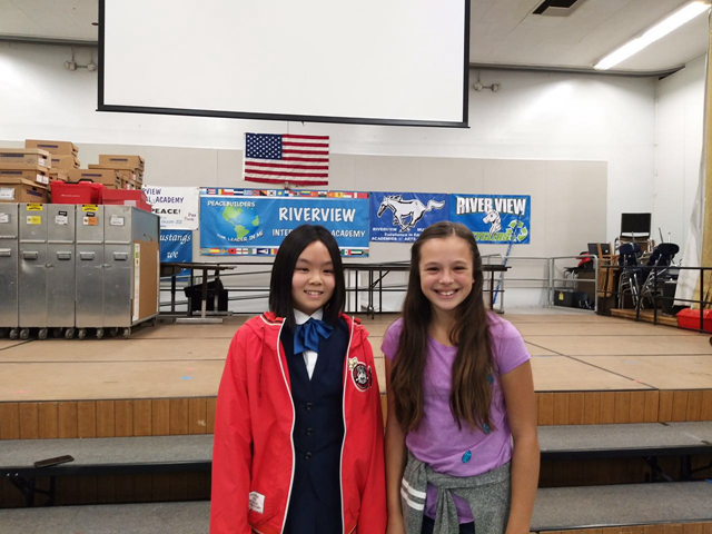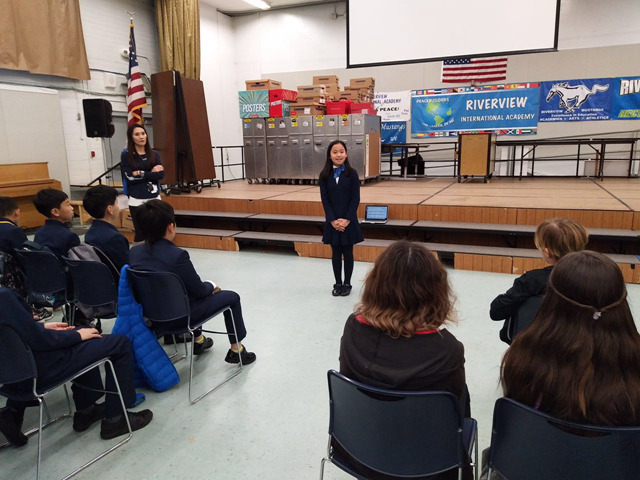 3月6日,学生们第一次走进“河滨小学”,学校为我们举办了欢迎仪式。美国学生们表演了精彩的节目,他们的活泼热情赢得了阵阵掌声。节目之后,校长 Steve Wills 对恒信彩的师生们致欢迎辞;朱校长代表恒信彩学校,把具有中国特色的礼物赠送给河滨小学,表达我们的感谢。接下来,Grace老师讲解了河滨小学的校规校纪,学生们明白:我们虽然是插班生,但是我们和美国学生一样要遵守学校的规则。最后,陈宣同学代表本次交换生进行了英语演讲。
