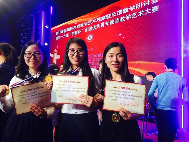 这次"创新杯"大赛能够获得一等奖,主要归功于我们小学部英语组这个团队。一堂好课,不是一个人的功劳,而是一个团队的心血。没有英语组的老师们一次次听课,点评,修改方案,不会有整个课堂流畅的设计。没有彭银花老师一次次帮我抠每个环节的具体时间,不会有整节课完美的时间呈现。最后没有董老师高屋建瓴的指导,这节课也达不到一定的高度。感谢你们,站在我背后的老师们,董主任!感谢你们,核心组成员,帮我修改PPT,制作教具!要去参赛了,李校说:"好好学习,放松心情!"朱校说:"比赛结果不重要,过程最重要。"在得知比赛结果时,远在美国的牛主任也发来了祝贺!感谢你们,我可爱的领导们!因为你们的支持,我更加的坚强和无畏!第46届"创新杯"落幕了,但它不是结束,而是下一个征程的开始:平日教学!在接下来的时间里,如何把这次学到的理论,经验应用起来,我想这是我最大的收获!