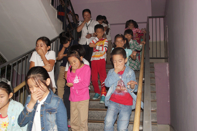 午饭过后,孩子们正在餐厅安安静静地休息。12点40分,一声急促的哨响打破了寂静,也拉开了安全疏散演习活动的帷幕……