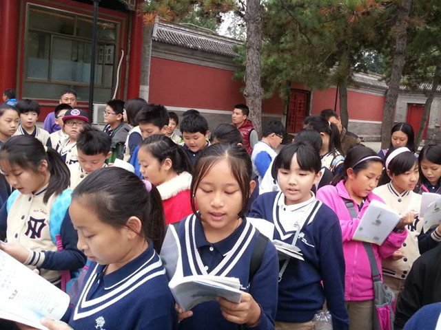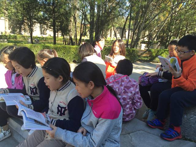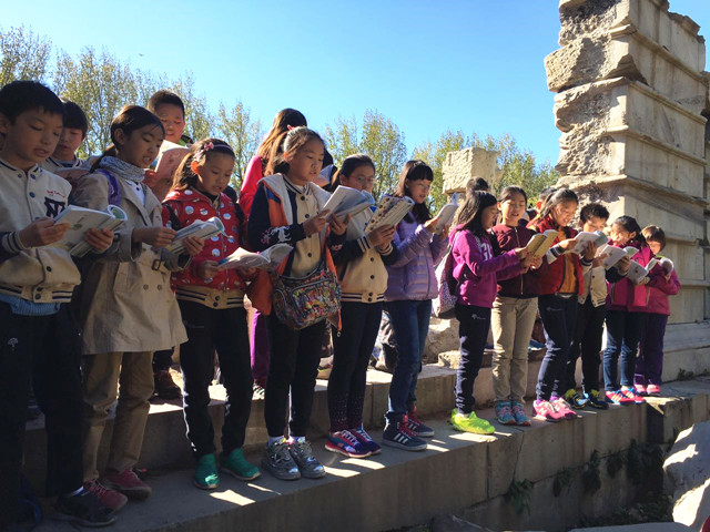 孩子们打开语文书,在大水法面前,再次大声朗读《圆明园的毁灭》这篇课文,让朗朗的读书声在圆明园响起。对于这一课的学习不仅仅是课文内容和写法,更多的是对于历史的鉴证,对于未来的思考。
