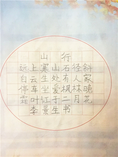 本次比赛活动以本年级所学的课内古诗为书写主题,同一年级的书写内容相同。以古诗词为书写主题,既能培养学生对书法的兴趣又能加深对古诗词的理解和热爱。初小部全体学生参加了此次比赛,并对此表现出了极大的热情。在硬笔书法比赛中,学生们坐姿端正,用心地书写每一个笔画、每一个汉字,表现出良好的书写习惯。所写作品笔画流畅,横平竖直,结构匀称,整体美观。