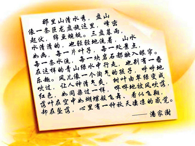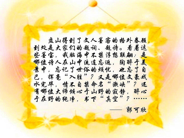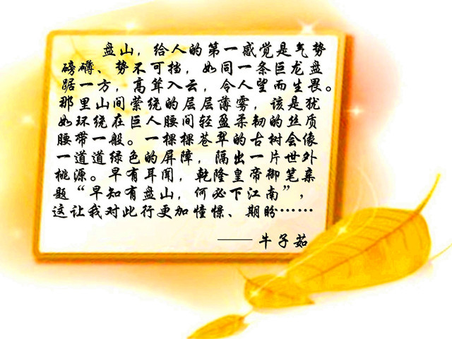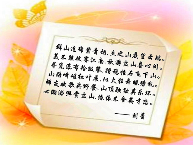 乘车一个半小时,我们远远地便看见了这久负盛名的京东第一山。深秋时节,盘山五彩斑斓:火红的枫叶掩映在苍翠的劲松之中,金黄的银杏点缀其间……薄薄的轻雾随风拂动,为美丽的盘山遮上一层梦幻般的纱。盘山如同一位九天而降的霓裳仙女,翩翩起舞。面对如此壮美之景,我们的心怎么能不激荡?