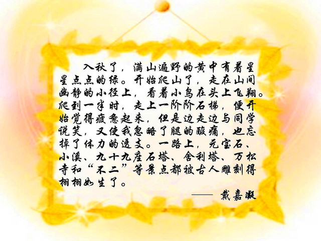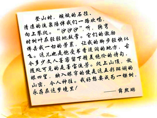 陡峭的山路挡不住我们前行的脚步,枯竭的体力磨不灭我们顽强的意志。老师的鼓励声不绝于耳,同学们你搀着我,我扶着你,心中只有一个信念——攀登,攀登!团结的精神激励我们不放弃!因为我们知道,唯有山顶才有极限的美丽。