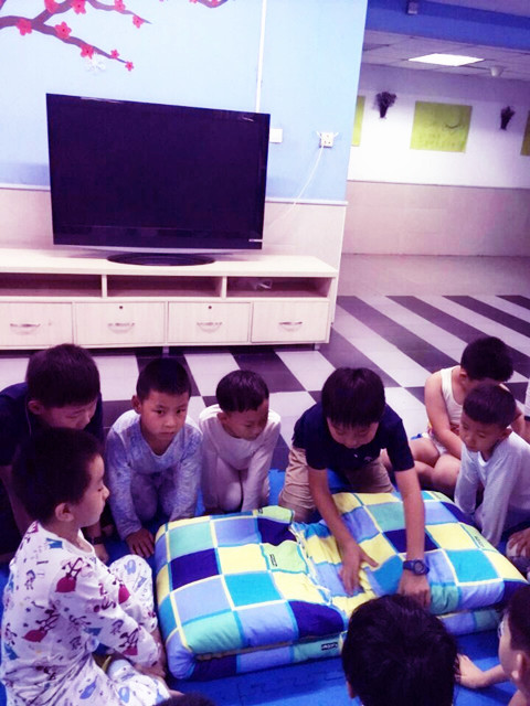 高年级的大哥哥们在逐一指导我们叠被子
