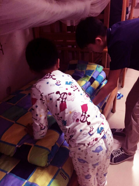 大哥哥们在耐心讲解叠被子的小技巧