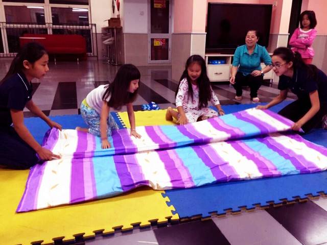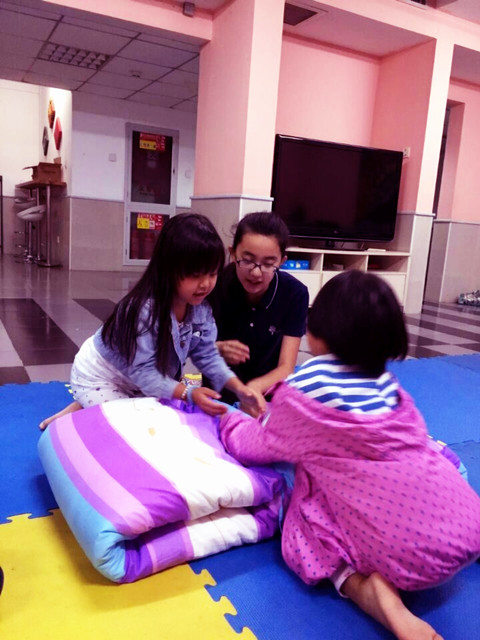 大姐姐说被子中间搭个“小拱桥”看我们学着大姐姐的样子也搭成了