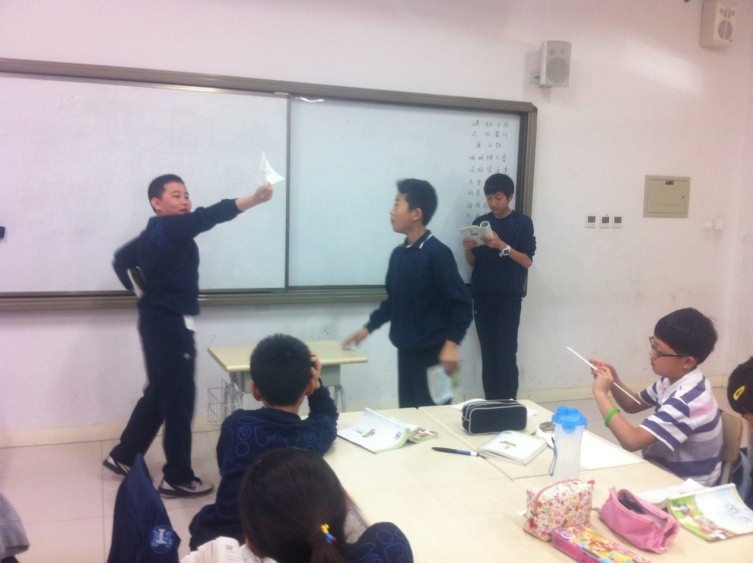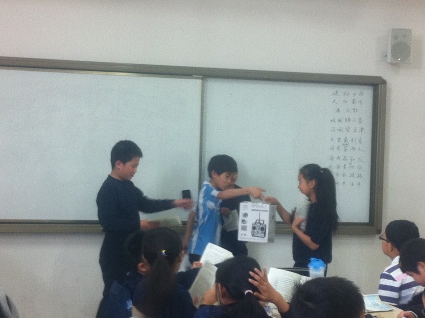 第二节课再次踏入五(三)班的教室时,我立刻就被学生带来的各种道具吸引了。看来学生在课下很认真地为这次表演做准备。开始表演之前,老师对大家说:“待会的表演同学们一定要认真观察,这样在我们的点评环节你们才能为别人的表演给出点评。”