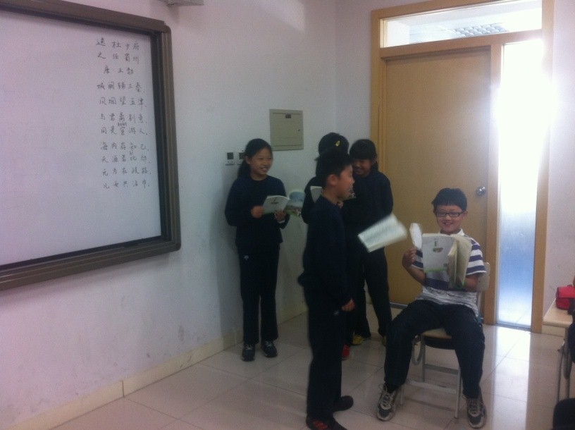由于本次课的特殊性,王老师特意安排了两个课时进行。第一个课时并没有直接进入教学主题-----课本剧的表演,而是师生共同准备的一个过程。上课铃响的时候,学生陆续回到自己的座位。有几个学生还在兴致勃勃的边走边谈论着什么事情,有的则开始准备课本、文具等。当学生们基本坐下时,我立刻被班内座位分布的形式吸引了。学生的座位不是传统的前后排,而是分成整齐的六个“方块”,每个“方块中”有5-6名学生相对而坐。
