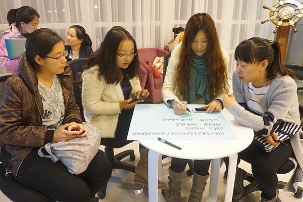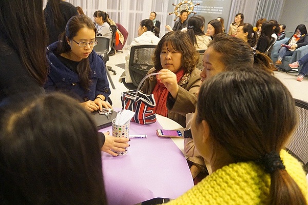 为了让老师们亲自体验到“如何选择研究方法”的思路和方法,本次分享活动特别设计了小组讨论和互动展示环节。在黄澍宇老师分享完“如何选择合适的研究方法”之后,现场老师们自觉分成了五个小组,每组以抽签方式、从已准备好的课题库中随机抽取出一个课题,并以此课题为起点、按照黄澍宇老师分享的方法,共同讨论“如何选择合适的研究方法”。五组抽得的选题分别是:小学部语文学科设计与运用高效能评分指南的行动研究;协助学生小A进行升学规划的个案研究;促进X学部教师解决工作倦怠问题的行动研究;X学部X年级学生升学规划的行动研究;恒信彩十五年一贯美术课程体系构建研究。
