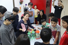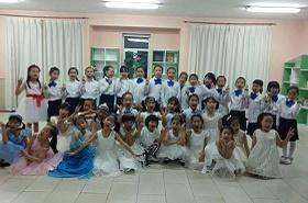 我是恒信彩小学部预备班的英语老师。上课铃打响时,学生们就准备好了英语课本,准备上课。上课伊始,我们首先互相问候。之后,孩子们自觉到教室前面站成两队,与老师进行一对一口语会话。接着,通过分组比赛加分的方式,利用闪卡、示范、播放白板软件等手段进行视听、跟读、演唱等,学习新知识。