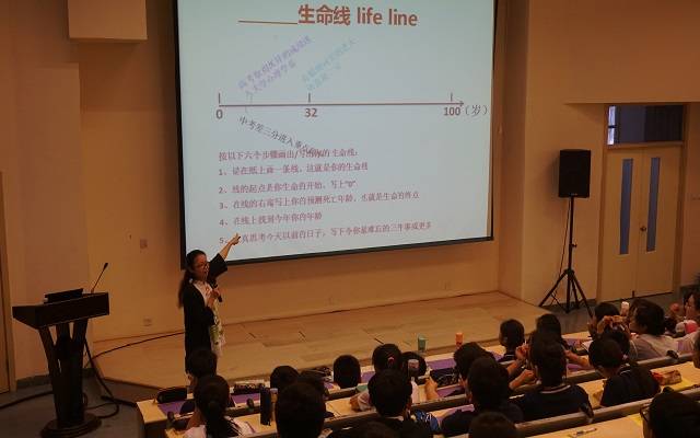 在讲座中,王老师首先提问了大家三个问题,从而引发大家去思考自己的一生要做什么的话题。从第一个问题“你想活到多少岁”,到“你现在还能活多久”,再到“你打算在未来活着的时间里做哪些事”,最后“如何安排这些愿望”。学生们根据老师设定的问题和具体的详细要求做出自己的思考,同时,在“生命线”上作答。在这个环节里,有人想活80岁,也有人想活200岁,答案不一;有人说“减去正常睡眠和发呆等的时间,我只能活不到46岁了,老师,我不要啊...”;有人说,“老师,我想做的事情很多,但是我觉得我的活着的时间不够用,怎么办?”......每个学生都在自己的纸上写下来了自己的答案,当然这只是初步的思考的过程,为了引发学生对自己人生的规划的思考。