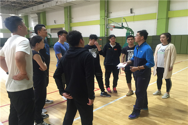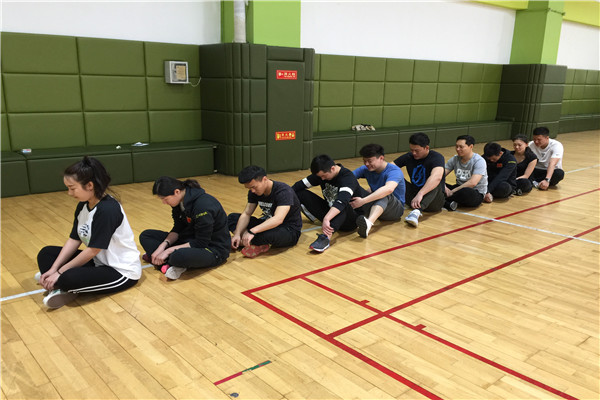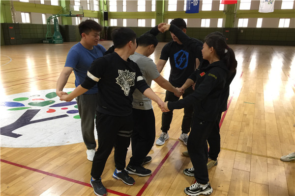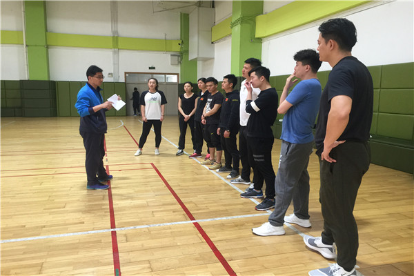 在开始阶段,孙铭伟老师带领所有教师通过游戏方式进行热身,将石头剪刀布进行了创编,更加能锻炼学生的下肢力量与反应力,能在最短的时间内达到热身效果,这种创新思维也启发了所有教师新的思考。接下来寇金龙老师用专业的拓展知识带领教师做了两个游戏,其一为同心环解手环,规则为所有人同手与不相邻的人相牵,在不松手的情况下所有人解开手环成同心环。其二为驿站传输,规则为所有人面向同一方向,由最后一人将信息在不说话的规则下依次传输给第一人。