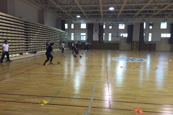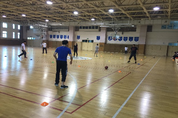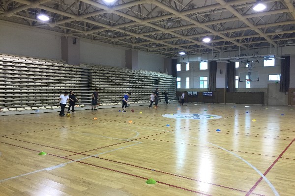 本次教研内容是足球脚内侧传球,通过游戏“二龙戏珠”的方式带领我们热身。热身后进行足球过障碍运球,过障碍运球是练习球感的重要手段之一,随后进行两人一组脚内侧传球练习,随着各位老师对内侧脚踢球的逐步掌握,进行了四角传球练习来增强老师们脚下对球的控制。最后在慢慢熟练的基础上,分组进行了比赛,在分组对抗中,各位老师的球感有明显的提升。