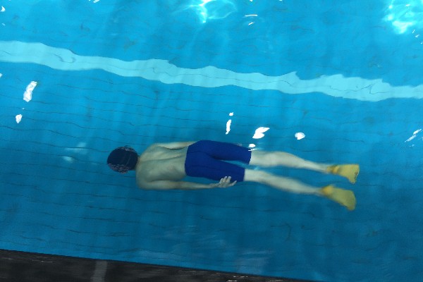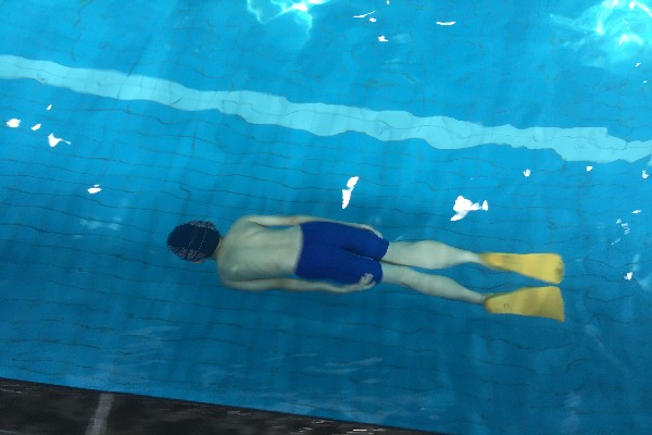 3. 躯干、臀部、打腿、膝关节和脚蹼是如何沿着相同的路线运动。所有的部位均沿着相同的路线从水中游过。