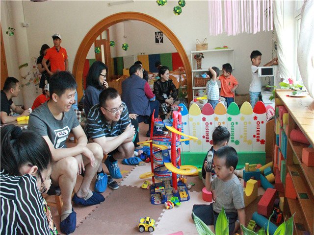 六一的清晨是从爸爸们悄悄走进教室,与孩子们一起玩儿区域游戏开始的。爸爸和我一起建高楼、搭大厦;爸爸和我一起画画,看看哪个像我哪个像他;爸爸和我一起捏彩泥,我俩到底谁更心灵手巧呢!游戏之后的暖心环节,温情上演,小朋友亲手拌的沙拉,与爸爸一起分享;爸爸辛苦啦,请你喝一杯热茶;爸爸你累吗?我来为你揉揉肩,也许我的动作不够标准,但是爸爸,你一定知道,那也是我对你的爱。
