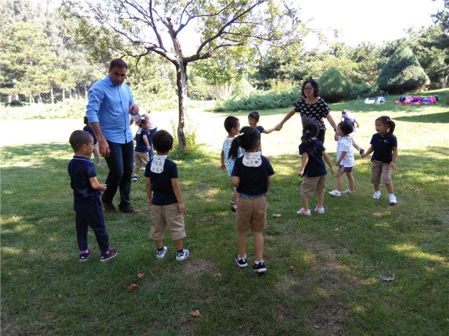 今天我们将带领孩子来到第一站——和园景逸。一大早,孩子们带着一丝激动、喜悦和对秋天充满无限好奇的美丽心情出发了,在水果家族老师的带领下共同发现并分享、讨论着一路上看到的各种新奇事物。伴随着悦耳的儿歌,孩子们到达了此次秋游的目的地和园,这里湖水清澈,青草青青,孩子们在草地上跑着、跳着、笑着,玩的不亦乐乎。