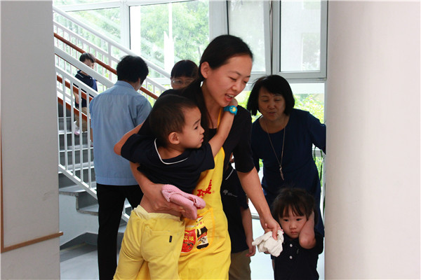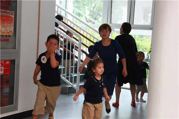 伴随着紧急警报声响起,演习开始。各班教师按照消防预案的疏散线路有序带领幼儿撤离,分三道楼梯迅速下楼。