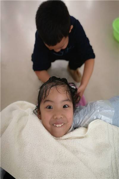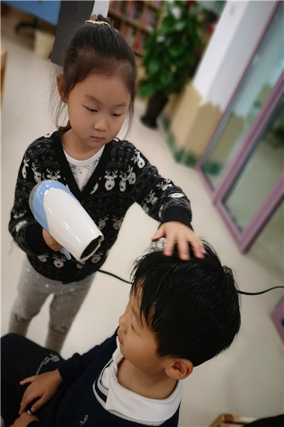 小朋友们有的化身成为“Tony老师”,有的化身成为“Rose老师”,为其他的小朋友做泡泡头发造型,疯狂的设计师们终于到了大显身手的时候,每一个造型都展示着小设计师内心世界的疯狂。