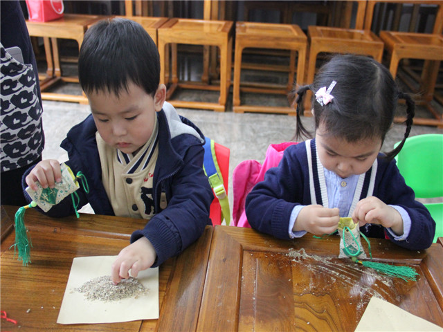 最后,小朋友们走进了金芳书院,认识碾碎药品、称量药材的工具,了解枸杞可以让我们的眼睛变亮,并品尝了枸杞;知道泡到水里会变得胖胖的药是胖大海,可以治疗嗓子疼;知道我们夏天经常喝的酸梅汤是乌梅做的,酸梅汤里放了很多的糖才会变得酸酸甜甜的,所以要少喝酸梅汤;了解预防感冒的草药,并自己动手制作了防流感香囊。