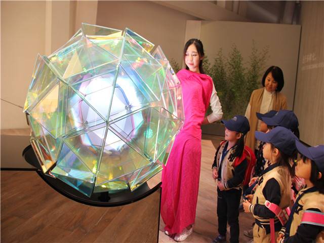 讲解员姐姐为小朋友们示范玻璃球的神奇