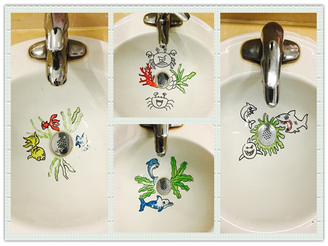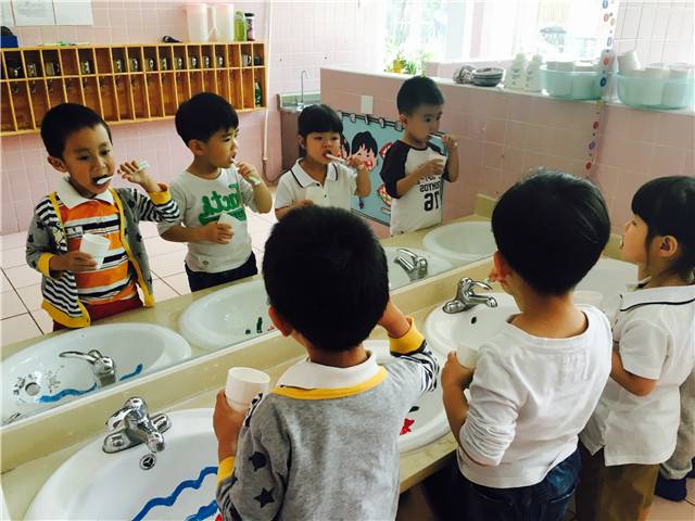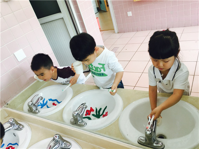 水池变成鱼塘,仿佛几条小鱼在池中游荡,吸引孩子们的围观,他们议论纷纷。此时老师告诉幼儿这几条小鱼非常喜欢吃小朋友们留在嘴巴里或牙齿缝隙的小菜叶。幼儿纷纷争着回答:“吃完饭,我们要刷牙、要漱口,将嘴巴里的小渣渣喂给小鱼吃”。从此,幼儿主动做到饭后漱口(不到3岁幼儿)或刷牙, 完成后还要看看池子里发生了什么,每餐喂小鱼自然也就成了习惯。