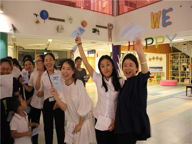 随着哨声,游戏结束了,老师们回到一楼大厅把自己组的字最快凑齐,并大声朗读着…..幼儿版------高兴来园,按时到,自己的事情,自己做……。