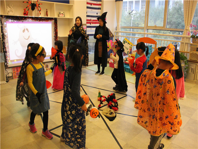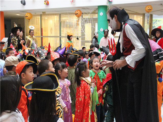 在老师们精心的布置下,幼儿园里洋溢着神秘的色彩,弥漫着快乐的气息。随着knock, knock, treak or trict的音乐响起,身着各式各样服饰的孩子们齐聚在幼儿园大厅,恒信彩幼儿园的“万圣狂欢Party”在200余名师生的欢呼尖叫声中拉开了序幕。幼儿跟随着外教老师一起欢唱着万圣节歌曲,Hip-hop Halloween小朋友们全场舞动。