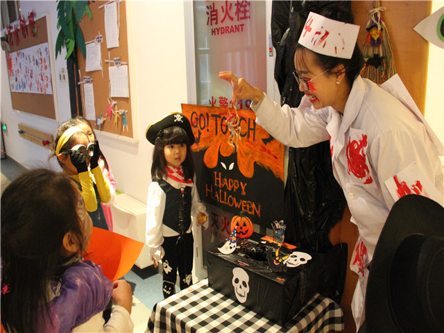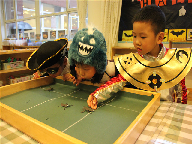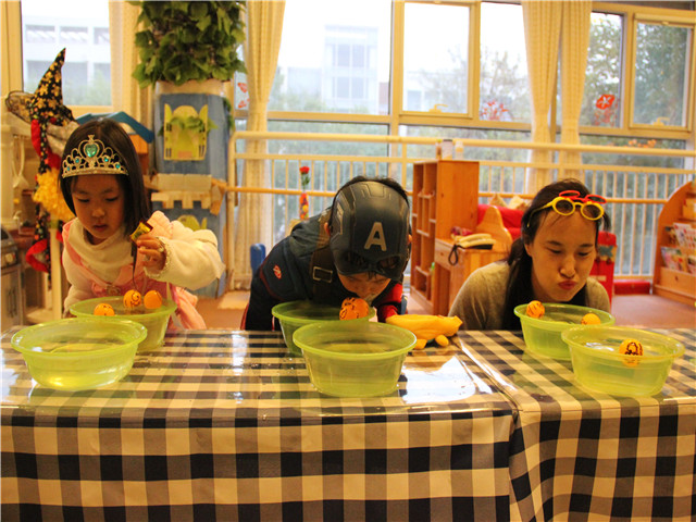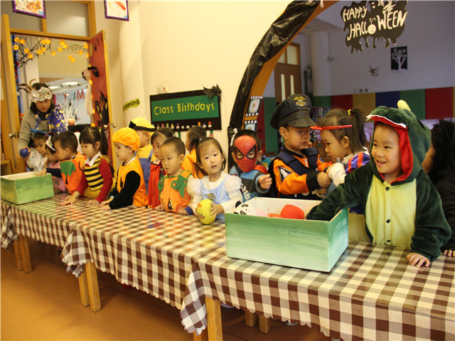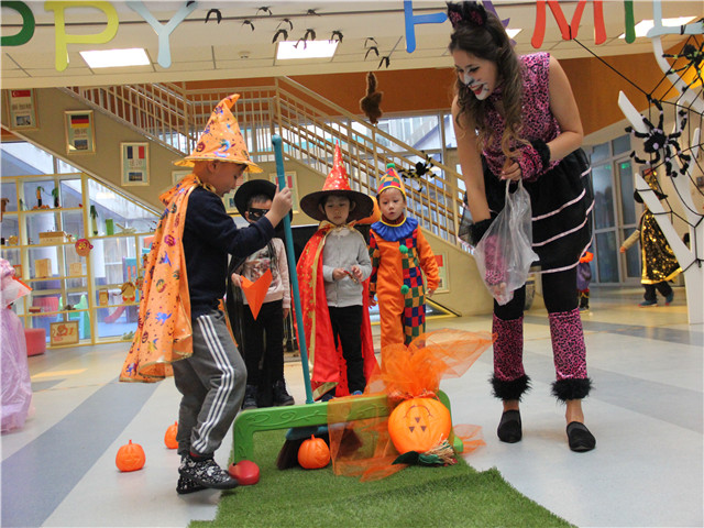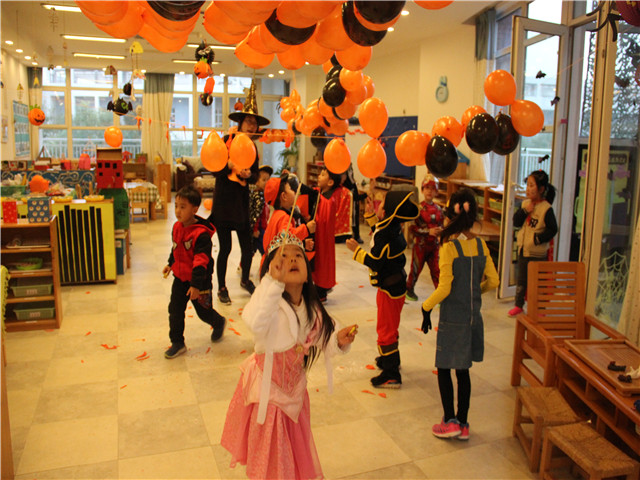 大厅舞蹈结束后,幼儿开始了万圣游园等一系列的趣味活动。每个班级都精心准备了万圣节的经典游戏:Feed pumpkins, Touch scared box, Spider webs, Halloween movie, Go away monster, Blow the candle, Catch witch's hat, Balloon piercing, Spider Race。幼儿自主选择自己想要参加的游戏,突破自己心里的恐惧大胆尝试每一项活动。