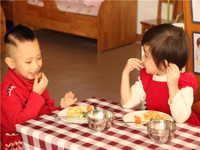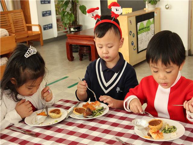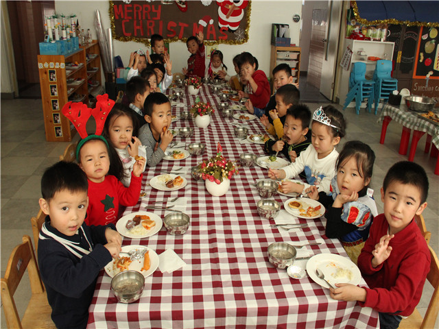 圣诞节里我们还准备了丰盛的“圣诞自助餐”。瞧,美味的烤火鸡,水果比萨,蛋挞,土豆泥等,瞧,孩子们吃得多欢呀!在自助餐活动中,孩子们一边选用着自己喜爱的食品,一边与自己的同伴自由交谈。在节日主题活动中,孩子们其乐融融,感受圣诞的快乐。同时也培养了幼儿关爱同伴、友好相处、互相谦让、大家分享、有序进餐的用餐文明礼仪。