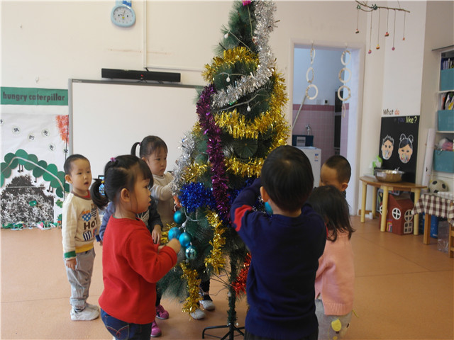 为了体现浓厚的节日气氛,圣诞周的第二天小朋友们戴上圣诞帽和老师一起亲手制作圣诞树、圣诞帽、圣诞袜、雪花片等装饰教室。有的在教室门口挂上了圣诞老人迎接小朋友;有的放上了圣诞树;有的亲手剪窗花装饰在窗户上。在营造圣诞气氛的同时,孩子们在动手制作的过程中也获得情感的体验,能力的提升。