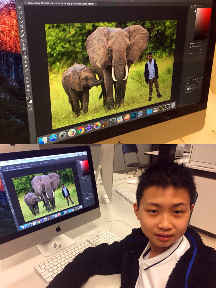 视听课上,我们学习使用Photoshop。瞧!我摇身一变,来到了大象身旁,与它开心“玩耍”。